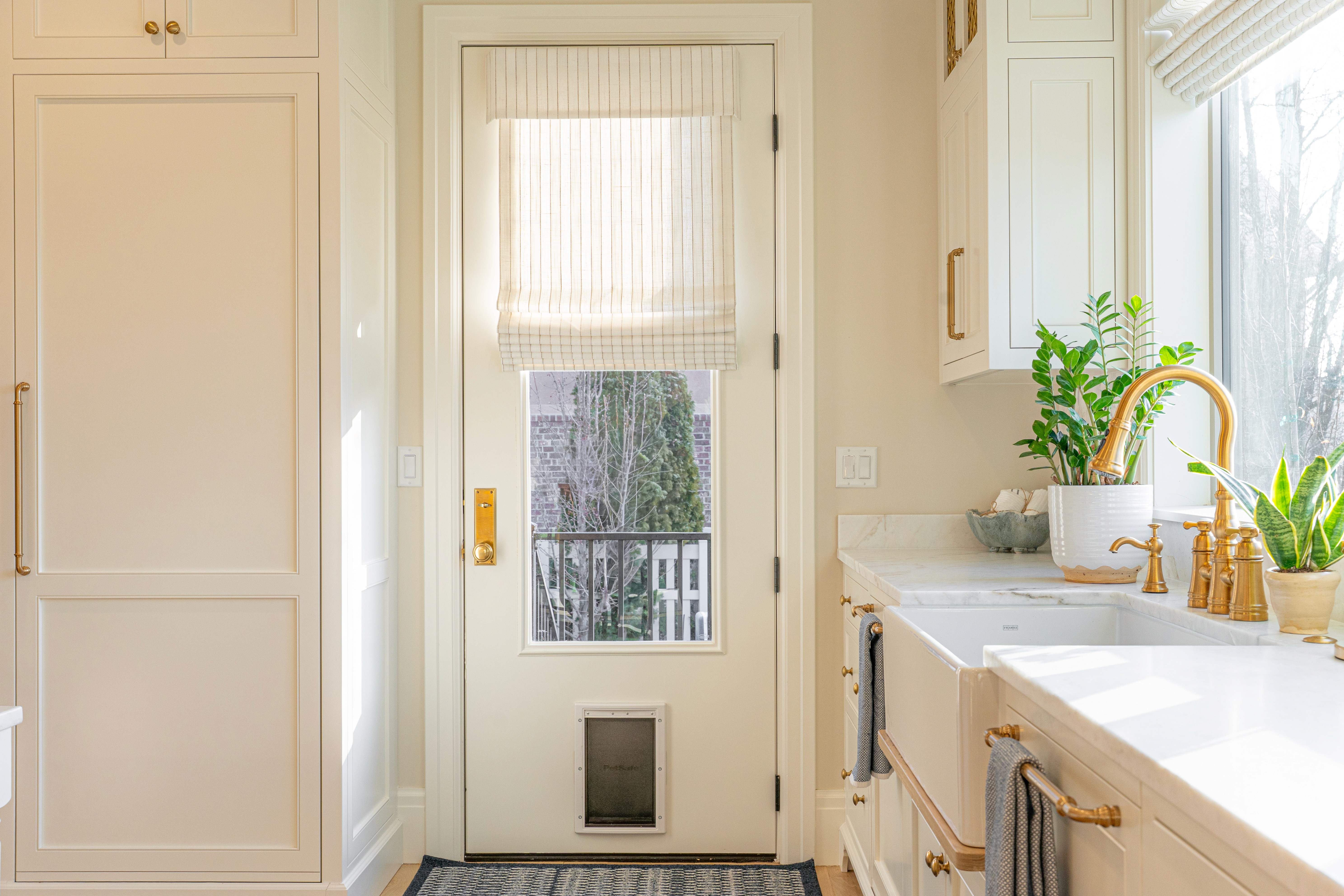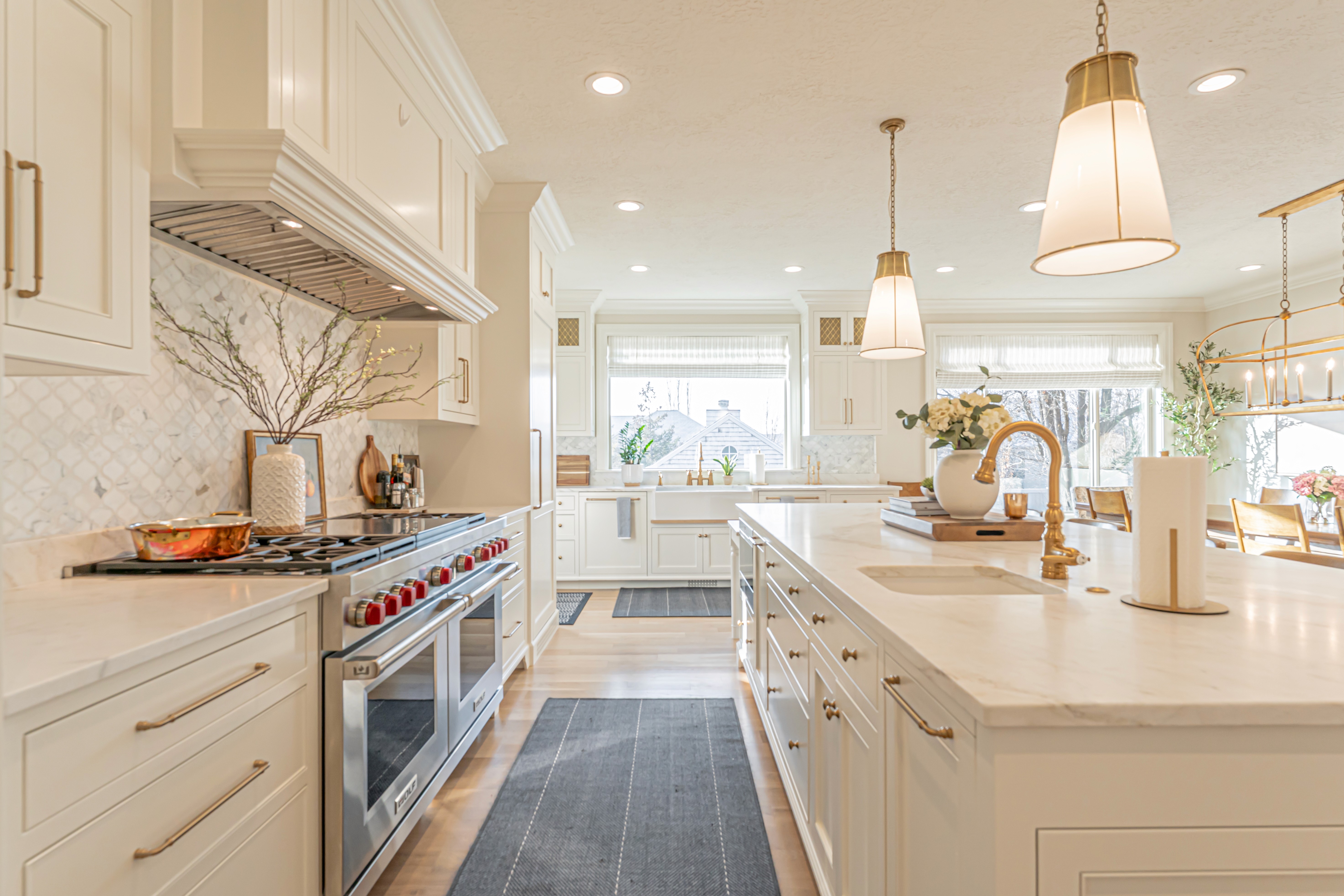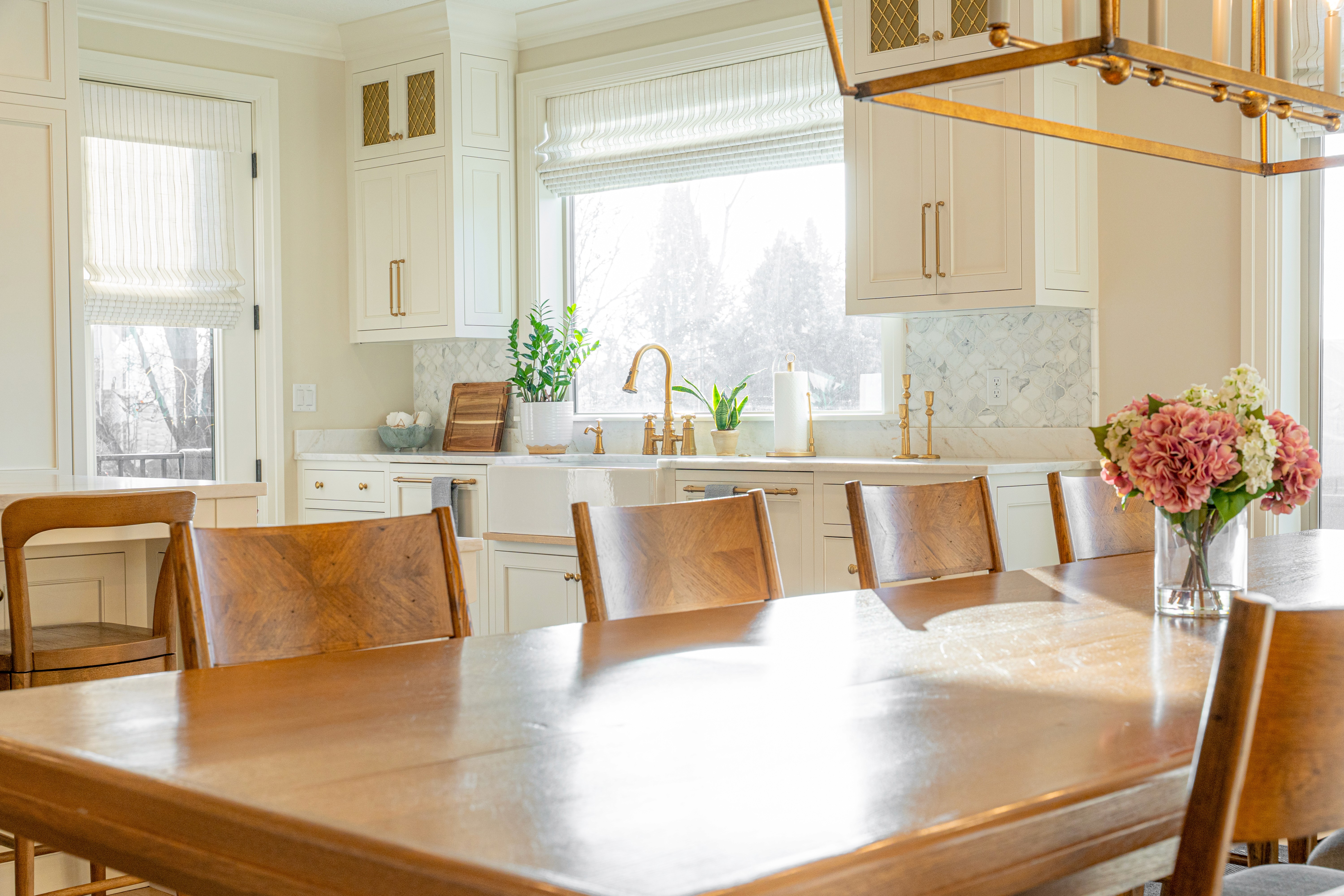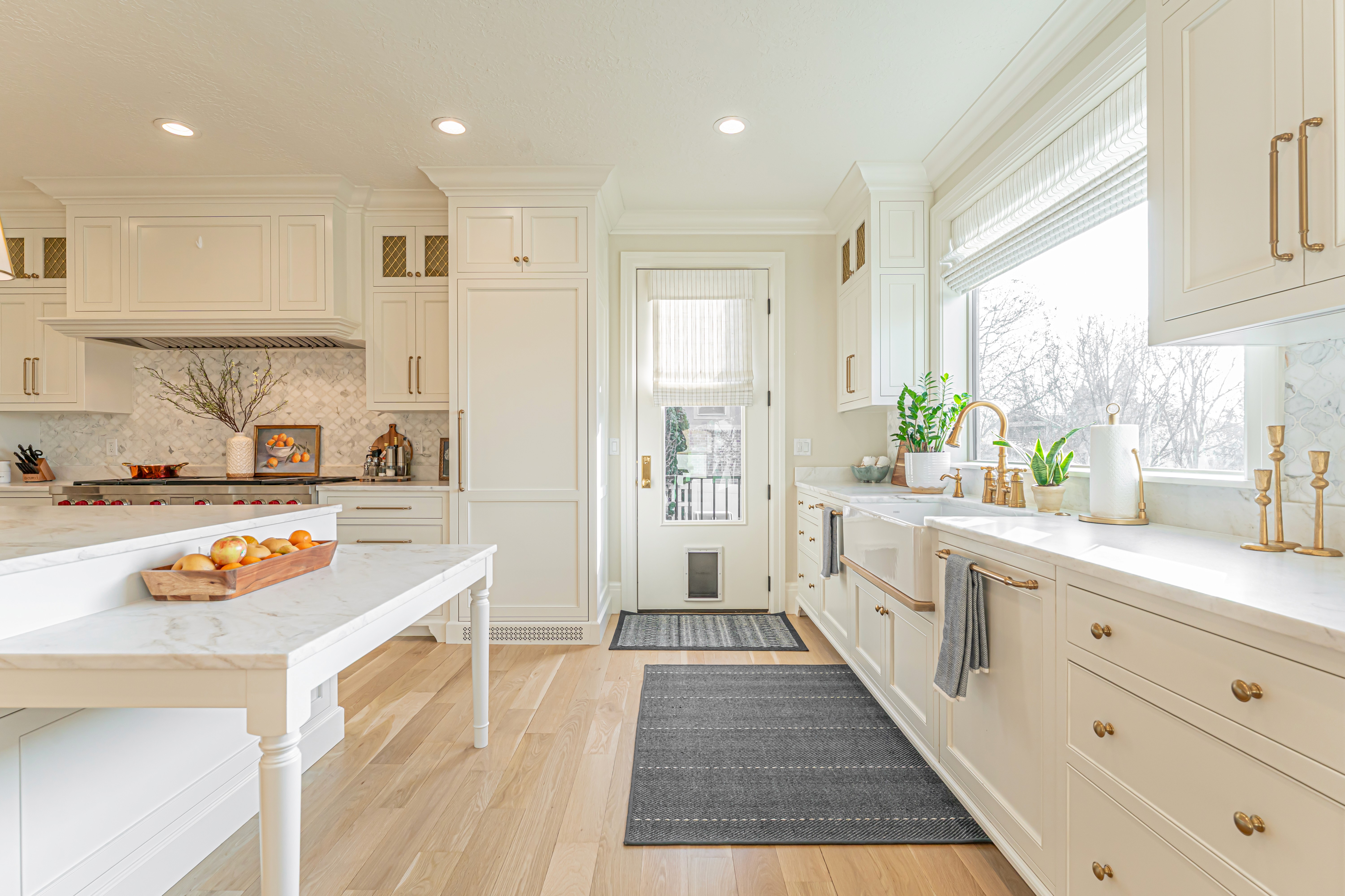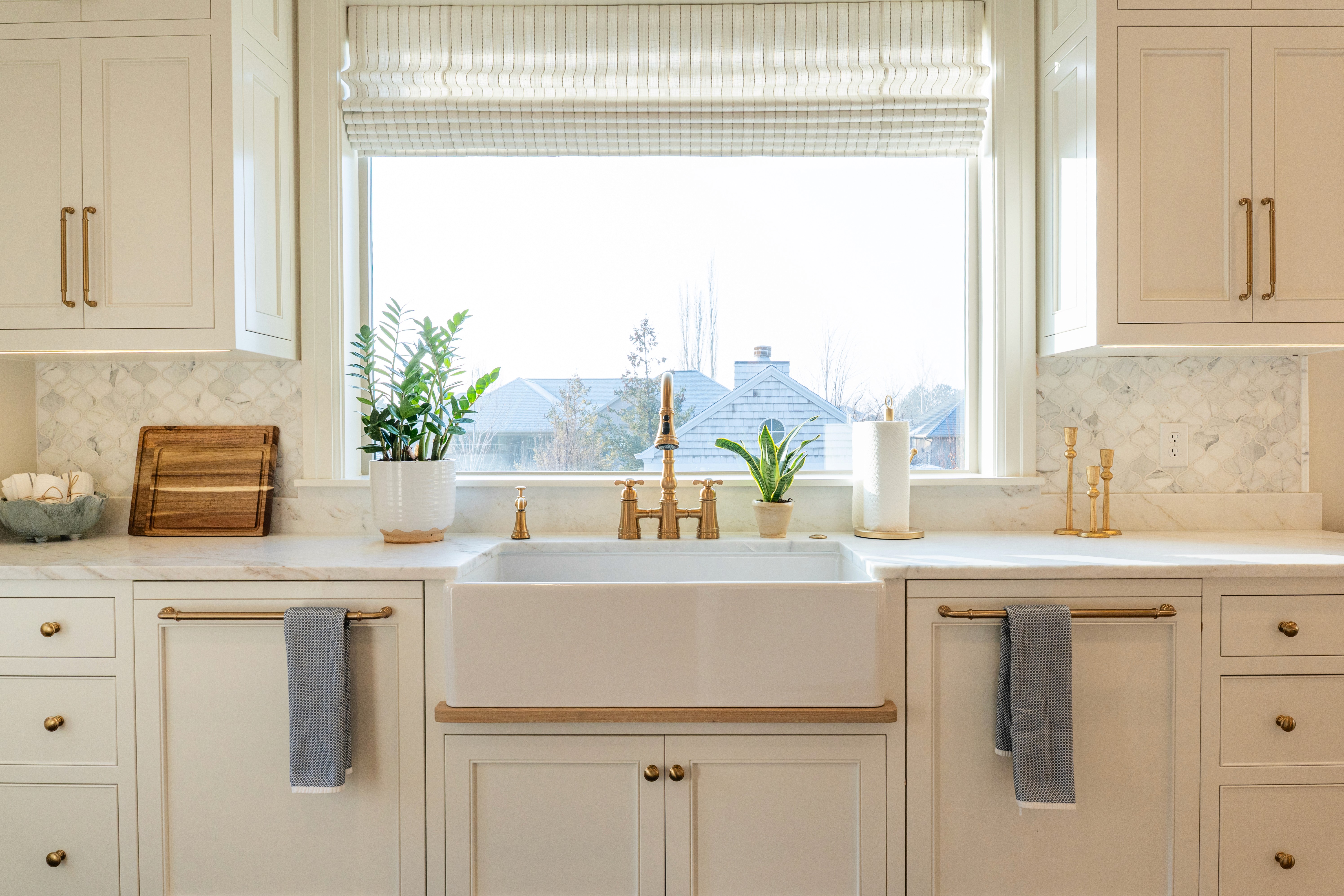 The kitchen was completely reimagined with custom cabinetry, marble countertops, and warm brass fixtures that bring both elegance and durability to the heart of the home. A farmhouse sink, detailed backsplash tile, and thoughtfully designed storage solutions ensure the space works as beautifully as it looks.
