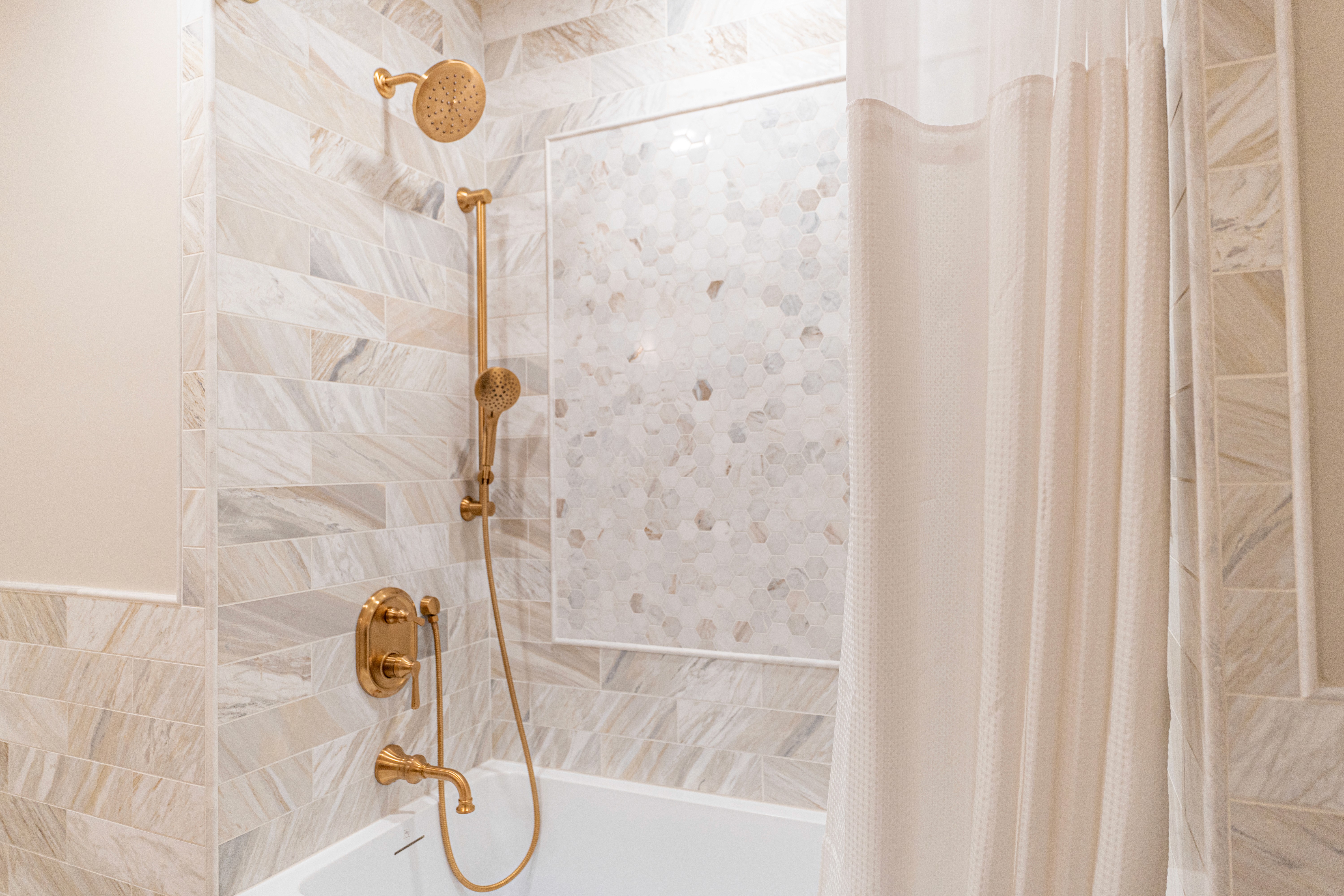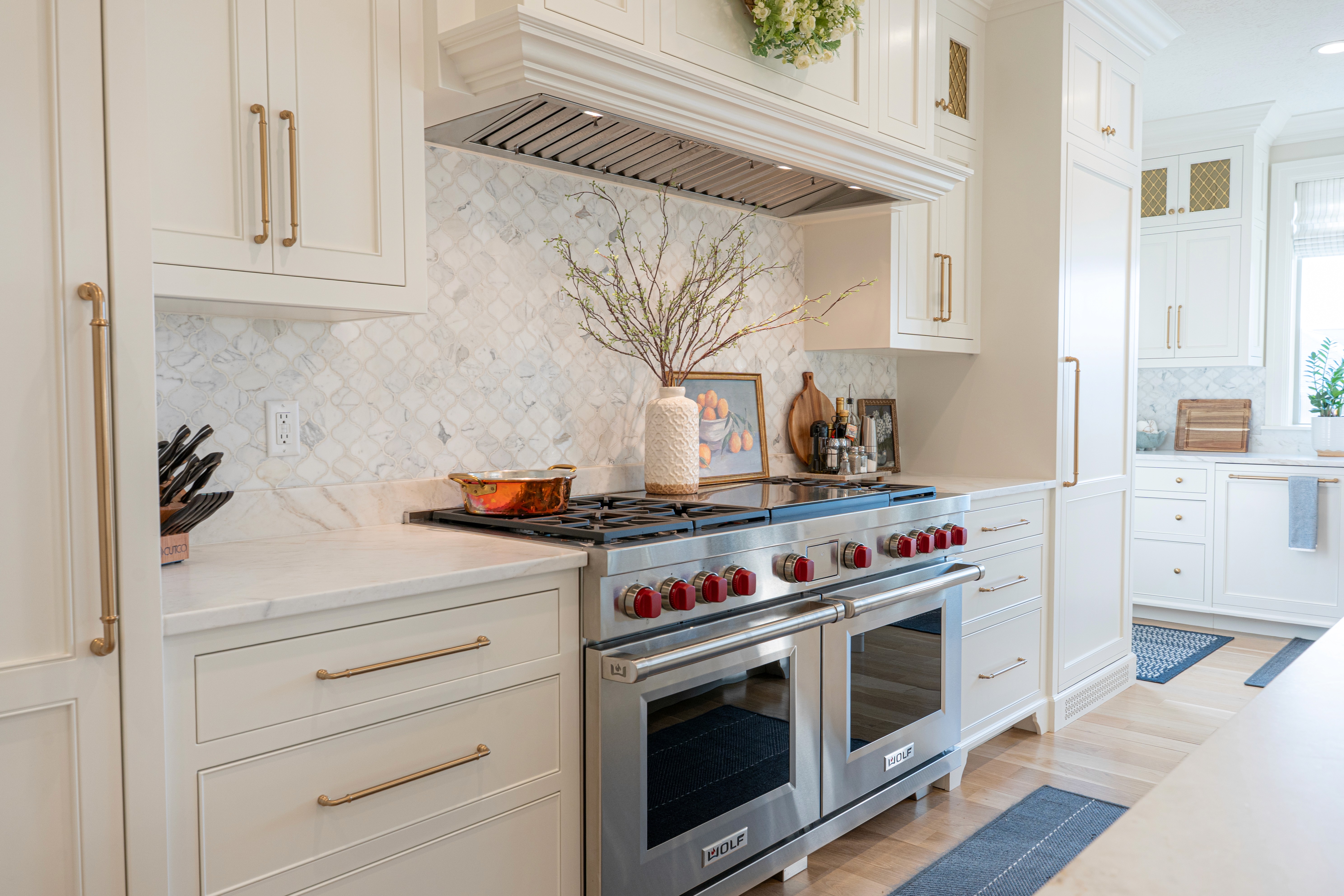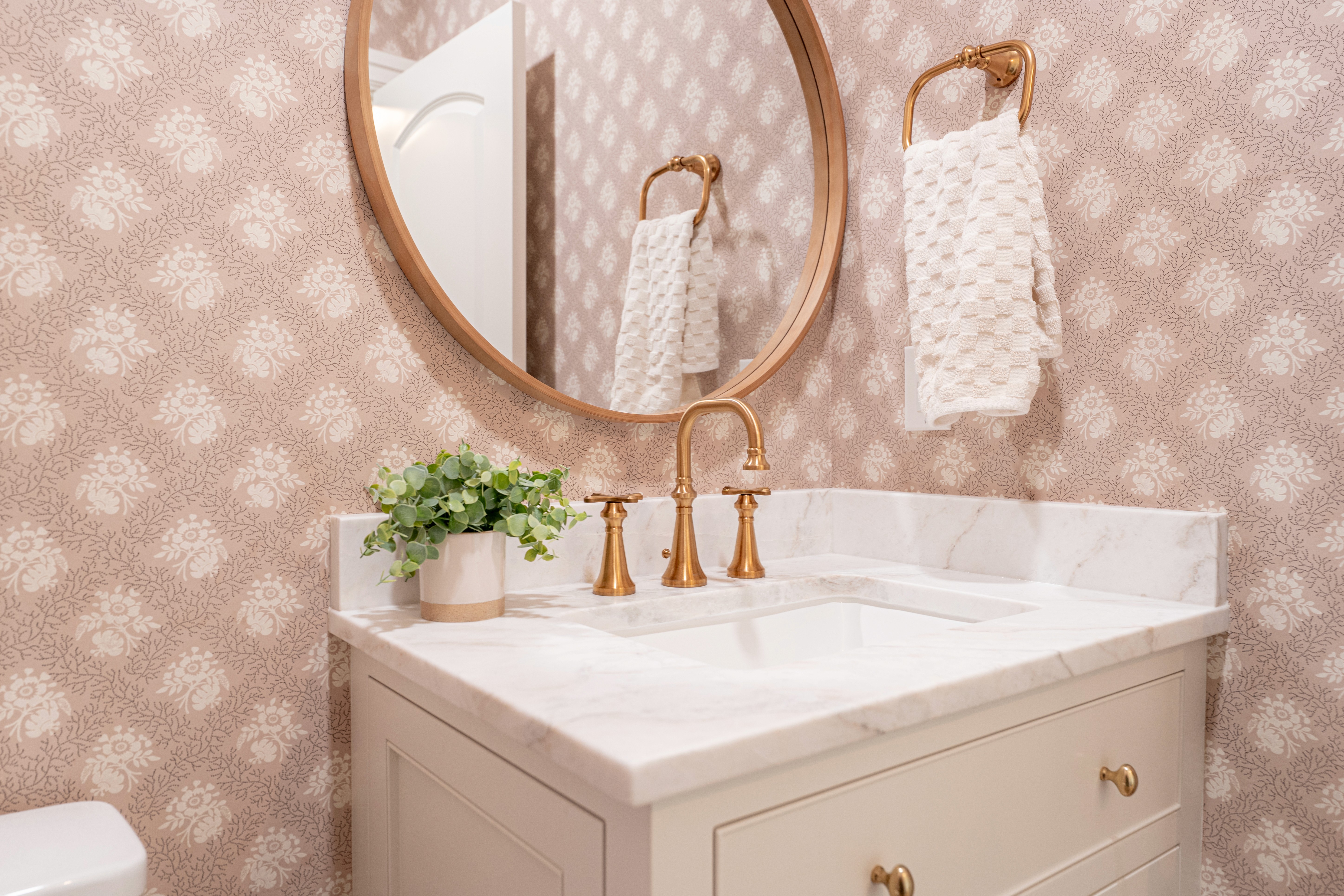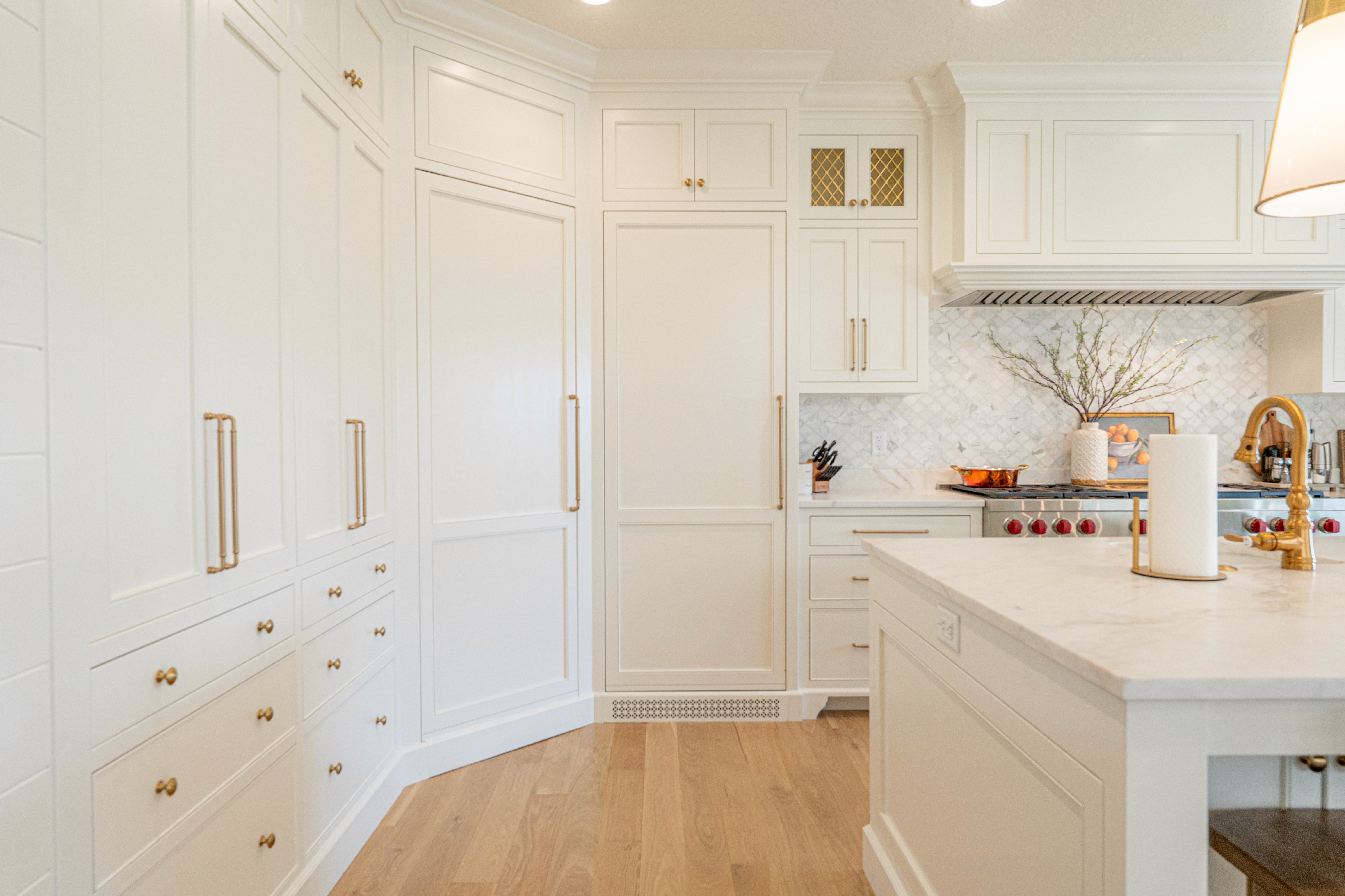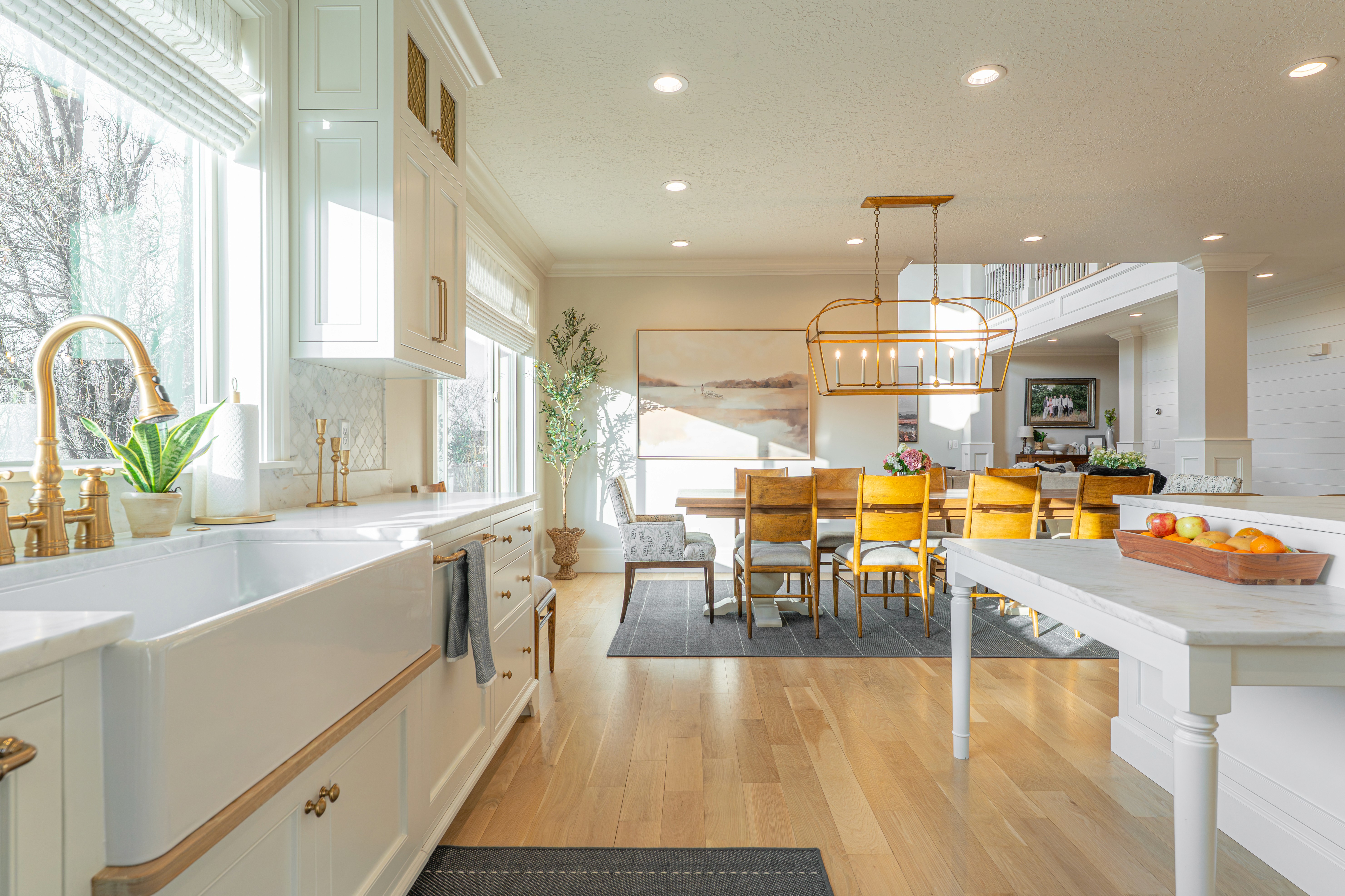 The kitchen was completely reimagined with custom cabinetry, marble countertops, and warm brass fixtures that bring both elegance and durability to the heart of the home. A farmhouse sink, detailed backsplash tile, and thoughtfully designed storage solutions ensure the space works as beautifully as it looks.