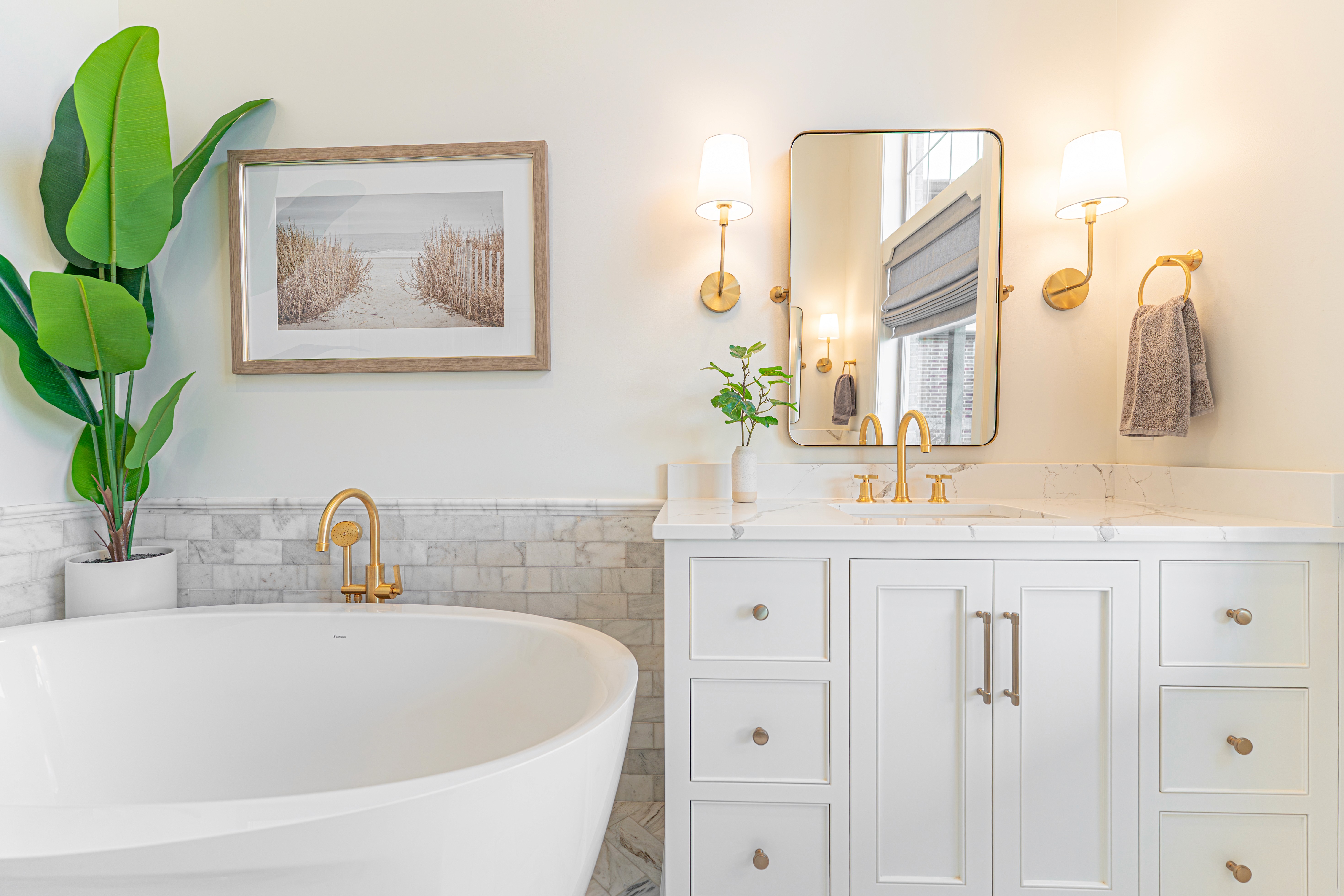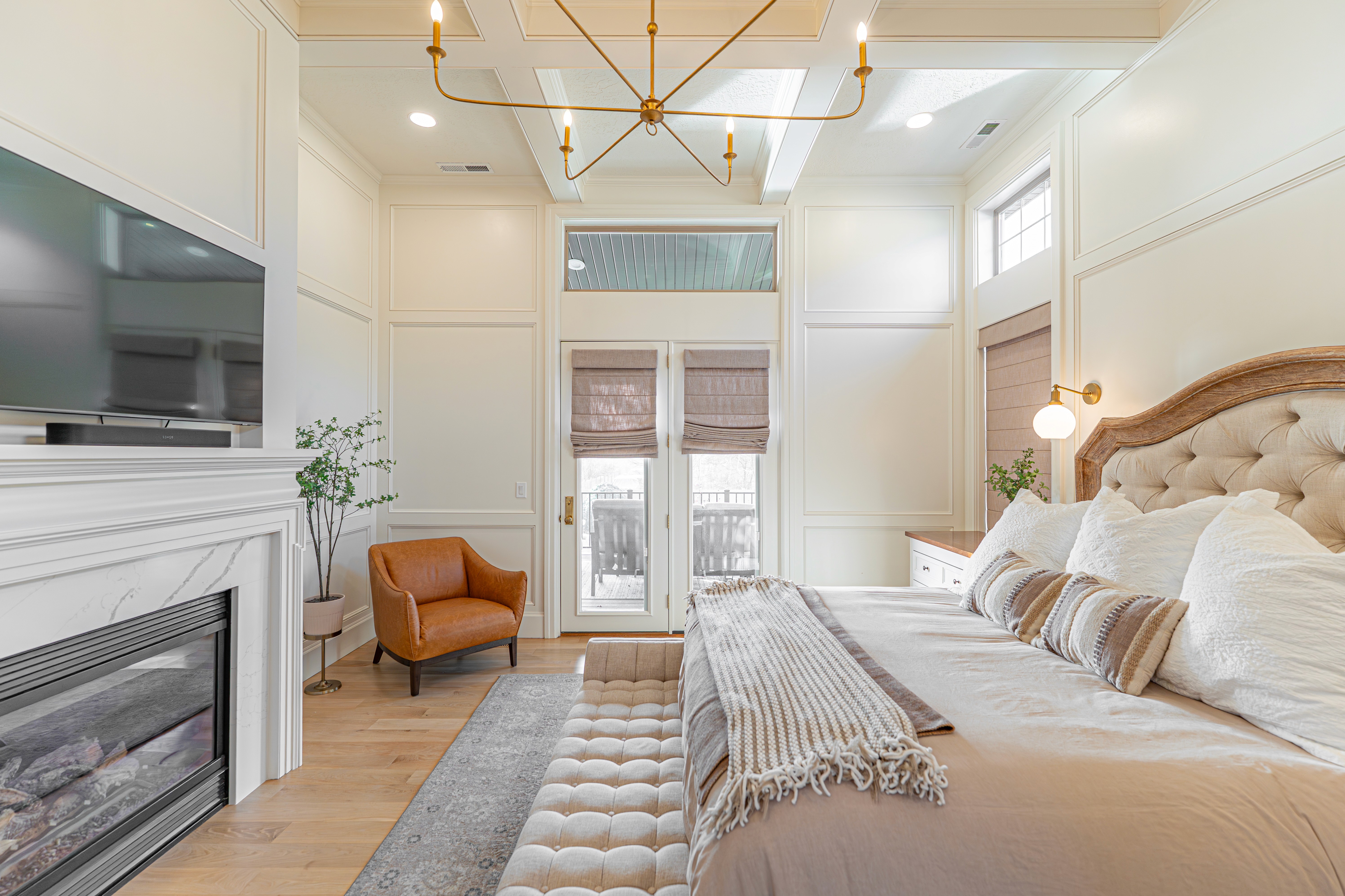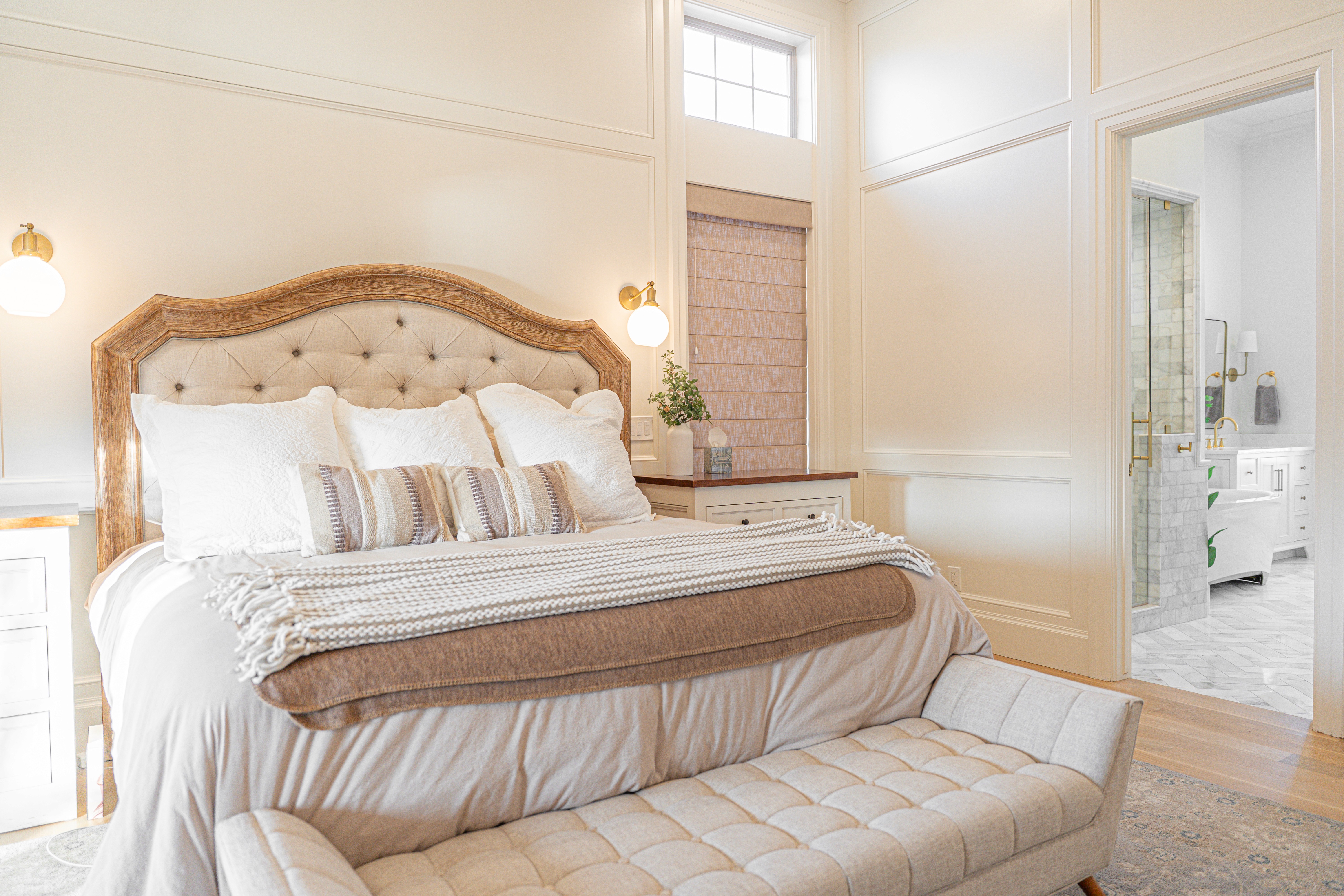 In the primary suite, the bedroom was redesigned to feel calm, open, and inviting. Clean architectural paneling, warm wood accents, and large windows create a relaxing retreat filled with natural light. The adjoining primary bathroom continues the elevated design with a freestanding soaking tub, marble tile flooring, custom vanity cabinetry, and classic brass fixtures that deliver a spa-like atmosphere.