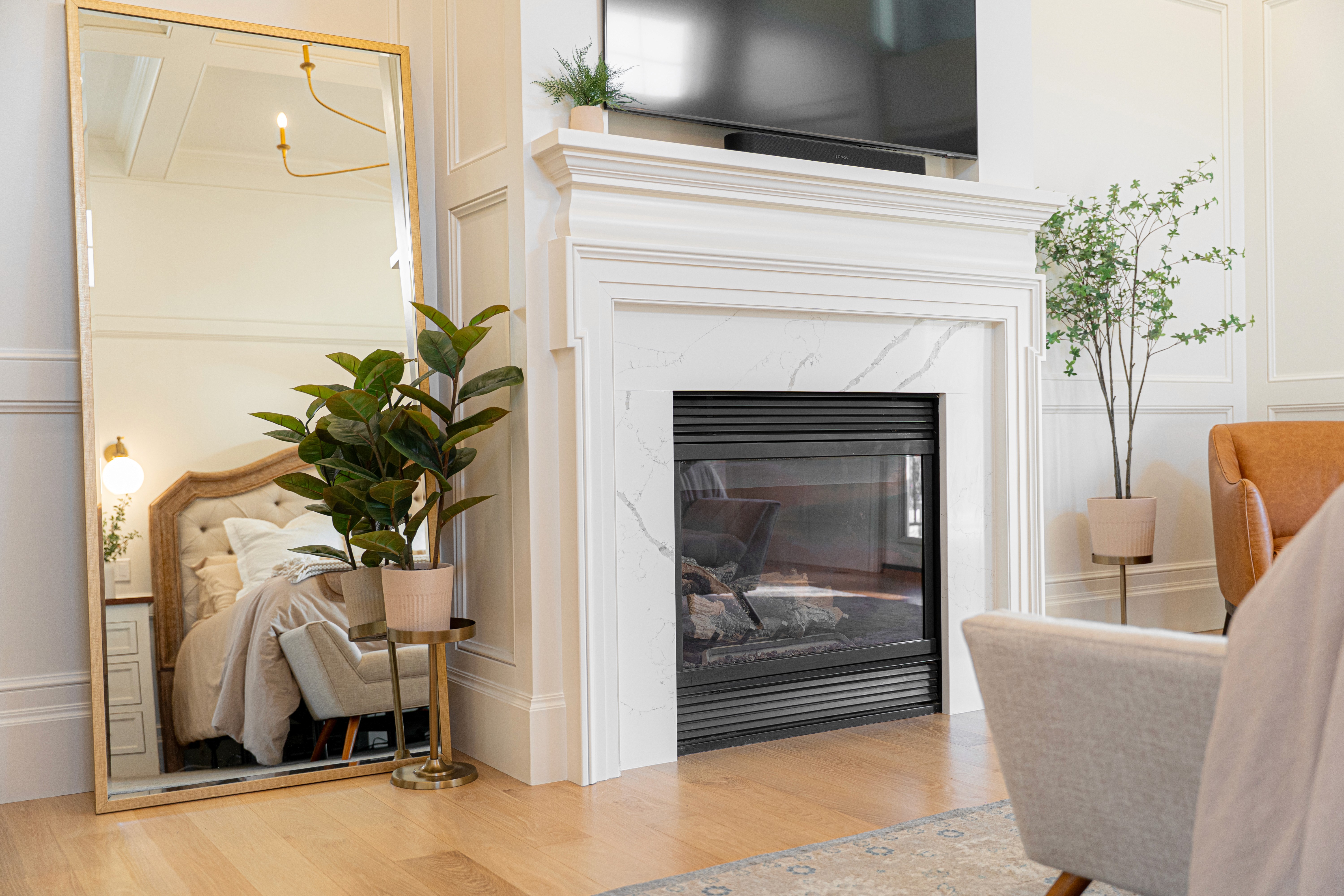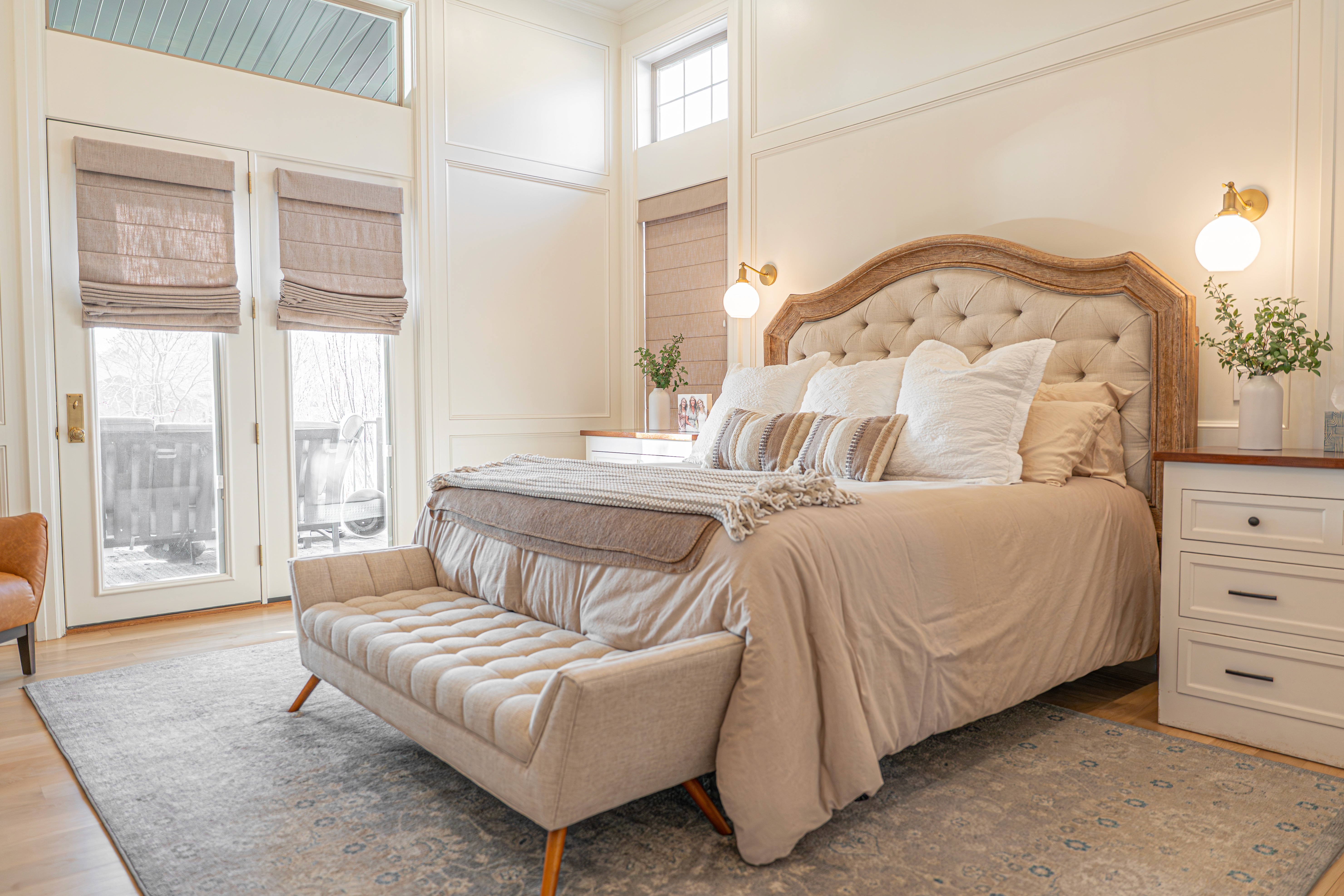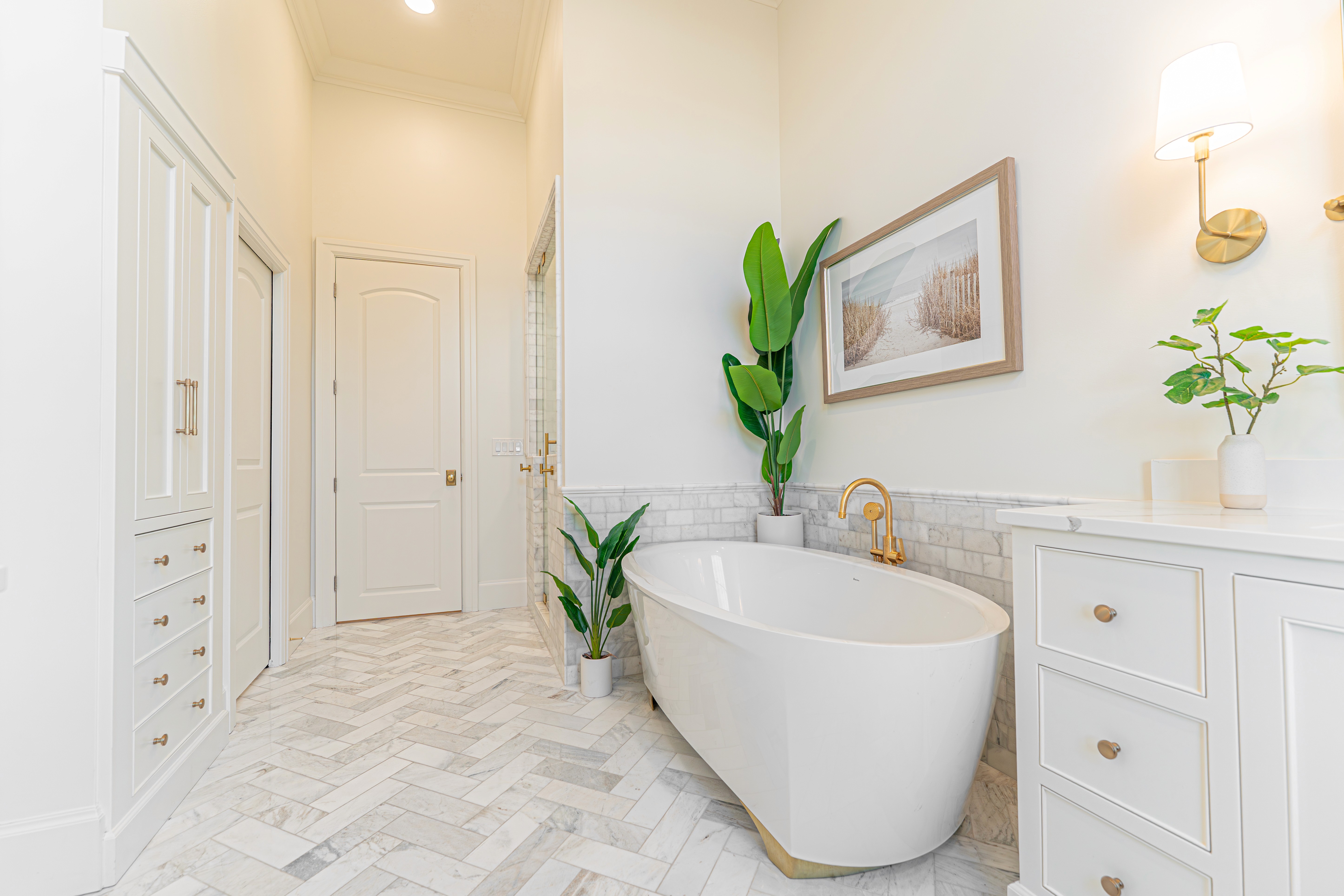 In the primary suite, the bedroom was redesigned to feel calm, open, and inviting. Clean architectural paneling, warm wood accents, and large windows create a relaxing retreat filled with natural light. The adjoining primary bathroom continues the elevated design with a freestanding soaking tub, marble tile flooring, custom vanity cabinetry, and classic brass fixtures that deliver a spa-like atmosphere.